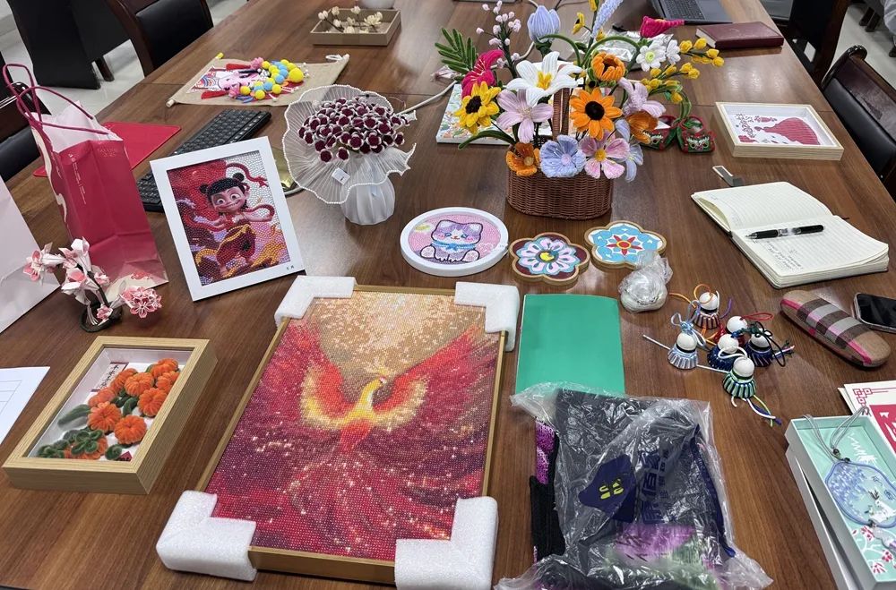 在手工作品活动中,广大凤凰女工积极参与,大家用巧手演绎创意,将匠心融入细节。本次活动共收到22幅作品,活动现场,参赛作品琳琅满目,既有滂沱大气的手工镶钻工艺品、小巧玲珑的手工绣鞋,又有精致的手工饰品、结合企业文化元素的创意作品,充分展现了凤凰女职工的灵巧与耐心,也映射出凤凰光学六十年来对精工品质的不懈追求。这不仅是一次艺术创作的体验,更是对工匠精神的致敬与传承。活动最后,经公司工会委员评选,共选出一等奖2名,二等奖3名,三等奖5名,所有参赛作品还以展览图形式在公司宣传栏展出,以供大家欣赏。