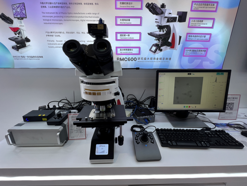 除了医疗及智能影像,凤凰光学在仪器领域还带来了一款BMC600电动荧光显微镜。这款产品可以实现多层扫描、多波段荧光叠加,同时还具备自动对焦功能,代表了当前光学仪器领域的先进技术水平。