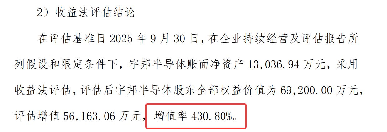 公告援引江苏中企华中天资产评估有限公司出具的《资产评估报告》称,以2025年9月30日为评估基准日,采用收益法评估后,宇邦半导体的股东全部权益价值评估结果为6.92亿元,较标的公司截至同日的账面净资产(约1.3亿元)溢价430.8%。