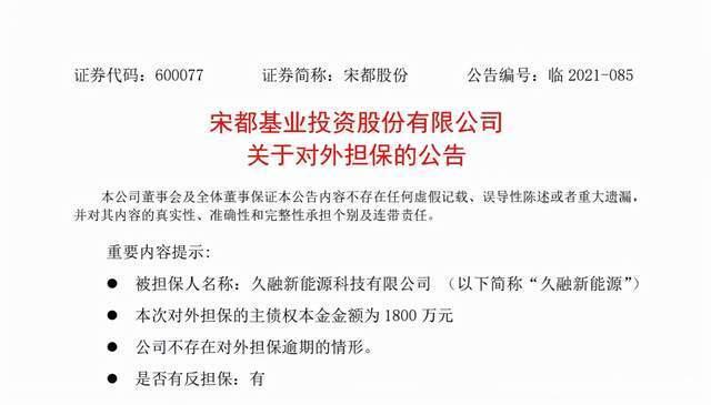 在发布半年报的当天,宋都股份还发布了一则担保公告称,因合作伙伴久融新能源自身贷款业务需要,宋都股份全资子公司对其贷款项目提供1800万元的信用担保。