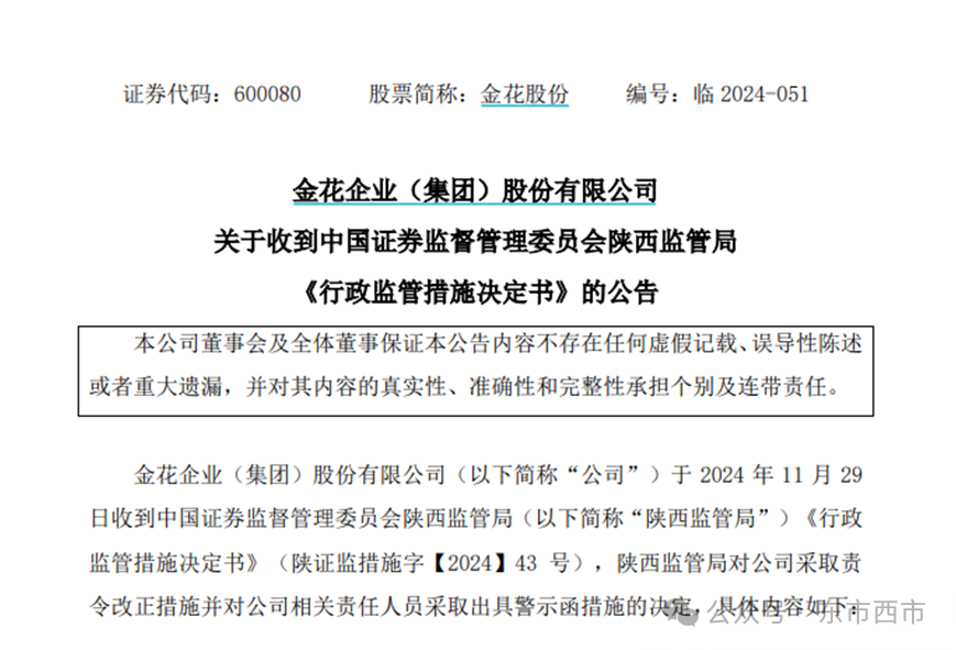 依照相关监管办法,陕西证监局决定对金花股份采取责令改正的行政监管措施,对责任人公司董事长邢雅江、总经理兼代财务总监韩卓军、董事会秘书孙明采取出具警示函的行政监管措施,并自收到本决定书之日起三十日内向陕西证监局提交书面整改报告。