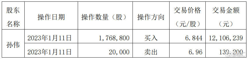 2023年1月11日,股东孙伟通过二级市场集中竞价方式买入176.88万股公司股票,占公司总股本的0.1574%,平均成交价格6.844元/股,交易金额1210.6239万元;卖出2万股公司股票,占公司总股本的0.0018%,成交价格6.96元/股,交易金额13.92万元。