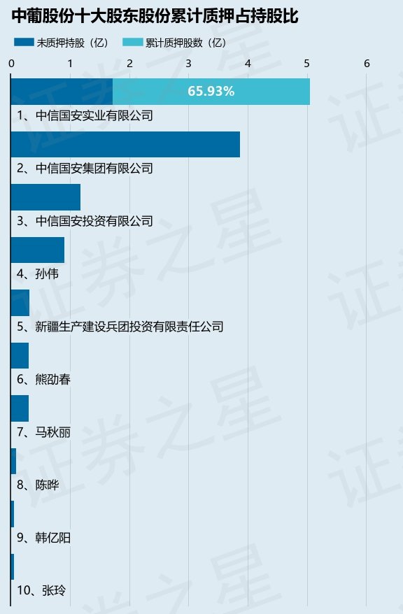 截止本公告日,股东中信国安实业有限公司已累计质押股份3.33亿股,占其持股总数的65.93%。本次质押后中葡股份十大股东的累计质押股份占持股比例见下图: