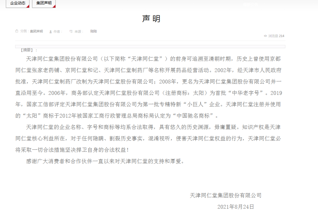 25日,针对北京同仁堂对天津同仁堂集团股份有限公司(以下简称“天津同仁堂”)提起商标字号侵权诉讼一事,天津同仁堂发布声明称,天津同仁堂的前身可追溯至清朝时期,其企业名称、字号和商标等均系合法取得,具有悠久的历史渊源,毋庸置疑。
