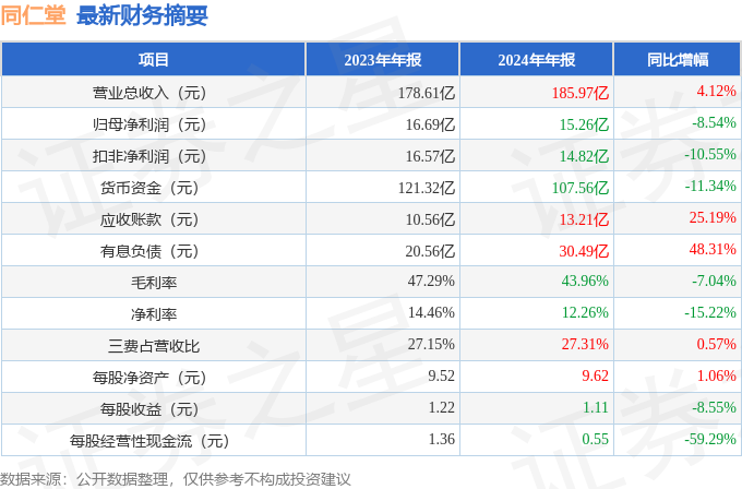 近期同仁堂(600085)发布2024年年报。根据财报显示,同仁堂增收不增利。截至本报告期末,公司营业总收入185.97亿元,同比上升4.12%,归母净利润15.26亿元,同比下降8.54%。按单季度数据看,第四季度营业总收入47.78亿元,同比上升15.41%,第四季度归母净利润1.76亿元,同比下降36.65%。