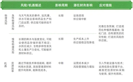 而在机遇方面,同仁堂则提到通过节能技术降低能耗,循环利用水资源,高效管理原材料提升利用率,降低成本。对此,同仁堂表示,引入节能设备与技术;运用信息化管理平台,精准把控原材料采购与使用,提升利用率。