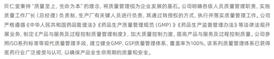 同仁堂在ESG报告中也着重强调了质量管理所遵循的相关法律法规和制度。