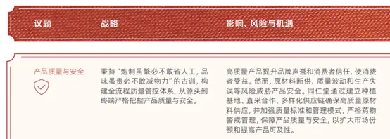 但此事确也引起了消费者对同仁堂产品质量方面的疑虑,从而影响了品牌声誉。同仁堂对此已经有所认知,将“产品质量与安全”作为ESG风险管理的重要议题之一。
