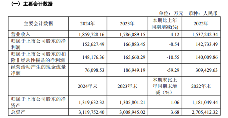 2024年,同仁堂实现营业收入185.97亿元,同比增长4.12%;归母净利润15.26亿元,同比下降8.54%;扣非净利润14.82亿元,同比下降10.55%,降幅略高于归母净利润。