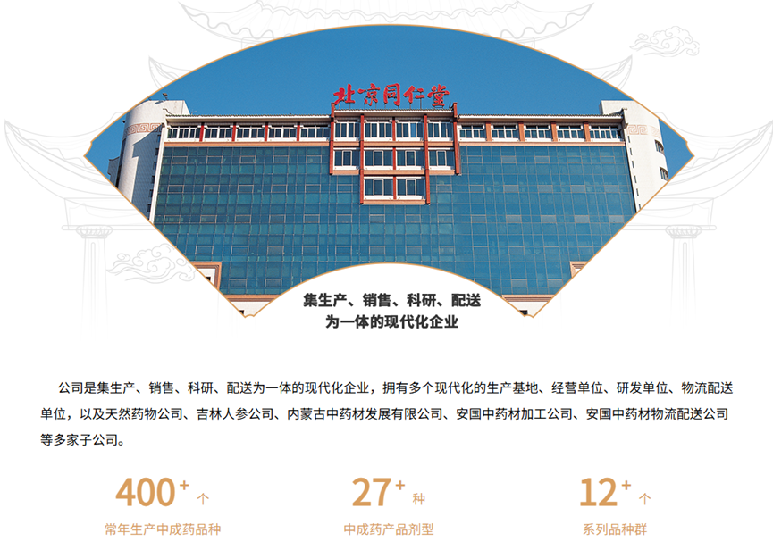 作为具有350多年历史的中医药老字号企业,同仁堂以生产和销售传统中成药为主业,拥有从中药材种植到药品批发和零售在内的完整产业链条,在国内中成药行业中位居龙头地位。