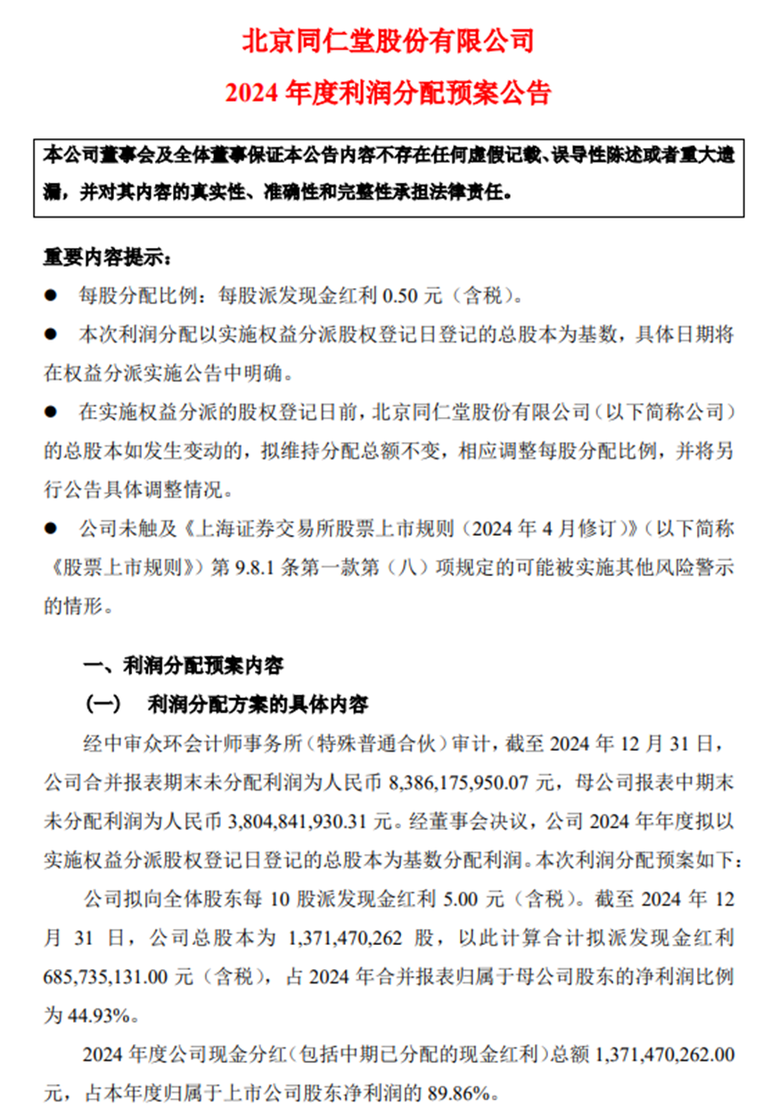 增收不增利的同时,同仁堂却在大幅提高分红比例。在中期分红6.86亿元的情况下,公司末期又计划分红6.86亿元,全年合计将分红13.71亿元,分红率达到89.86%。这一分红金额是2023年的2倍,分红率是2023年的2.19倍。