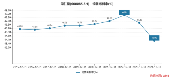医药工业与医药商业构成同仁堂核心收入支柱。2024年年报显示,两大板块分别实现营收119.12亿元、112.3亿元,同比增长7.52%与9.6%。但成本端承压,医药工业成本增速达14.04%,医药商业更攀升至15.52%,双双大幅跑赢收入增幅,受此影响,前述两大板块的毛利率分别同比下滑3.22个百分点和3.72个百分点。