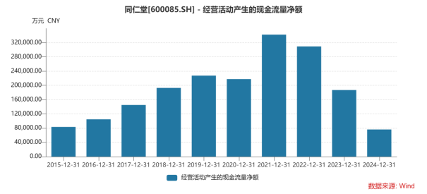 拆解业绩波动核心诱因,成本端的挤压效应显著。证券之星了解到,2024年同仁堂旗下医药工业和医药商业板块收入虽较上年同期呈现超5%的增长,但利润空间被持续压缩。一方面,以公司核心大单品安宫牛黄丸为首的诸多产品面临原材料上涨压力,即便公司通过提价策略试图转嫁成本,但收入增幅仍不及成本上涨幅度;另一方面,超200家零售门店的净增长也带来了渠道扩张成本的增加。受此影响,前述两大板块毛利率均现同比下滑,公司整体毛利率也下滑至43.96%,跌至十年内的低谷。值得注意,公司经营活动产生的现金流量净额也呈现10年来的新低,为7.6亿元,叠加2024年存货金额同比双位数增长,成本端的持续挤压与资金使用效率弱化,对公司盈利质量形成双重考验。