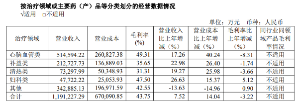 从产品结构来看,同仁堂医药工业板块涵盖心脑血管、补益、清热、妇科等核心品类。其中,心脑血管类产品凭借51.46亿元营收(占公司总收入27.67%),蝉联收入贡献榜首。然而,2024年该品类虽实现17.26%的营收增速,创近三年新高,但成本端压力骤增——营业成本同比暴涨40.24%,直接导致毛利率从57.62%大幅滑落至49.31%,降幅达8.31个百分点,是拖累整体盈利的关键变量。