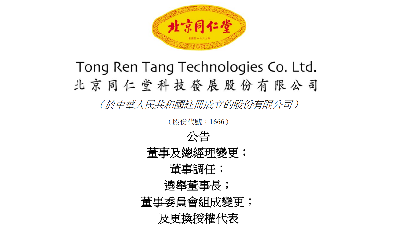 6月6日,北京同仁堂科技发展股份有限公司(下称“同仁堂科技”)发布公告,宣布董事长邸淑兵因“工作变动”辞任,同时披露多项高管职务变动及新任命。