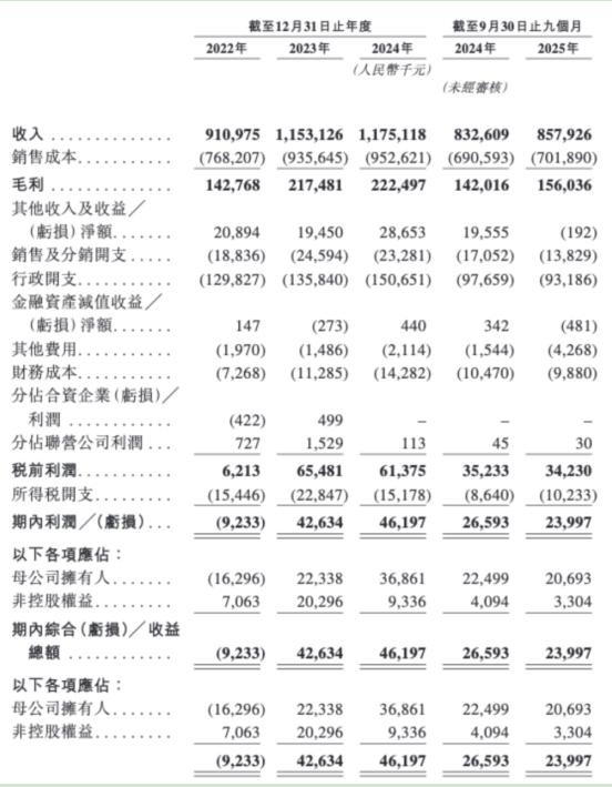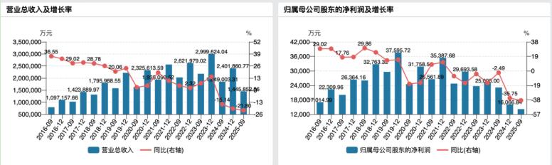 可就是这么一家曾经的“渠道王者”,2024年交出了近十年最难看的成绩单:净利润1.61亿,跌了35.75%,营收上市以来首度负增长(-19.93%)。2025年前三季度,双降的阴霾还没散去(如图)。