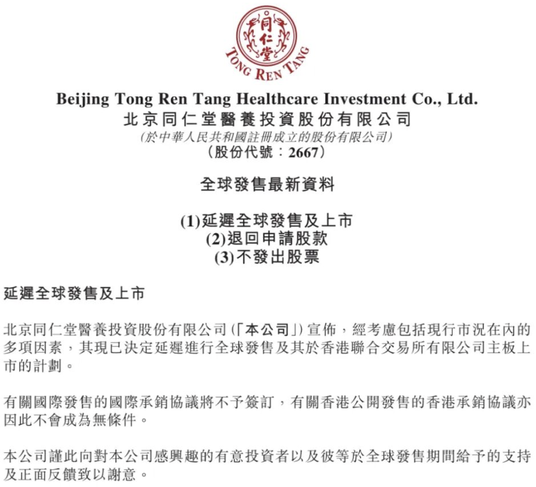 3月27日早间,同仁堂医养(02667.HK) 正式于港交所发布公告,宣布延迟全球发售及主板上市计划,而这家备受市场关注的中医药医养企业,原本敲定月30日正式挂牌上市,距离敲钟仅剩3天,IPO进程直接按下暂停键,打新资金也将启动全额退款流程。