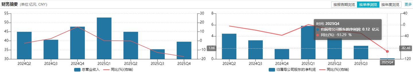 从季度数据来看,2025年一季度至三季度,公司归母净利润分别为5.82亿元、3.63亿元、2.32亿元,虽逐季下滑但维持盈利;进入四季度,归母净利润直接砸至1181.85万元,扣非归母净利润更是转亏,单季亏损近1540万元。