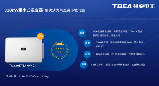 但沙戈荒项目面临现场环境差、运维难度大、电网薄弱等特点,因此对于光伏产品的环境适应能力、运维管理、产品设计以及电网支撑能力要求更高。针对沙戈荒恶劣环境故障率高等问题,特变电工新能源公司330kW组串式逆变器IP66全密闭性的设计,可实现内部无尘环境,满足C5防腐等级,表面120μm厚粉末喷涂,抗腐蚀性更优。产品采用先进的控制算法,包括有源阻尼,阻抗重塑,中点电位平衡控制算法,无功主动补偿算法等,实现了极弱电网适应性,可保障在SCR=0.97,串补系数≤0.7的极端工况下可靠并网,并通过高低电压穿越测试。