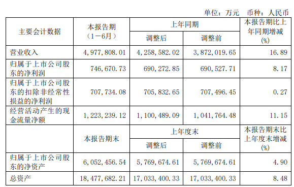 2023年上半年,公司实现营收497.78亿元,同比增长16.89%;归属于上市公司股东的净利润为74.67亿元,与上年同期的增长了8.17%;归属于上市公司股东的扣除非经常性损益的净利润为70.77亿元,同比增长0.27%。