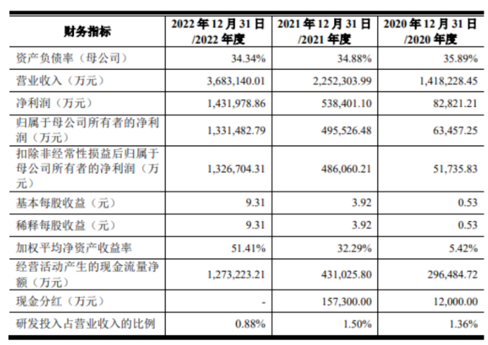 根据新特能源招股书披露的财务数据显示,具体来看,近三年,新特能源的营收由2019年的141.82亿元增至2022年的375.41亿元,复合增速约62.70%;相应的归母净利润则由6.35亿元增至133.95亿元,复合增速高达359.29%。在报告期内,新特能源的业绩一路飙涨,2022年净利润更是突破百亿级别,创历史新高。