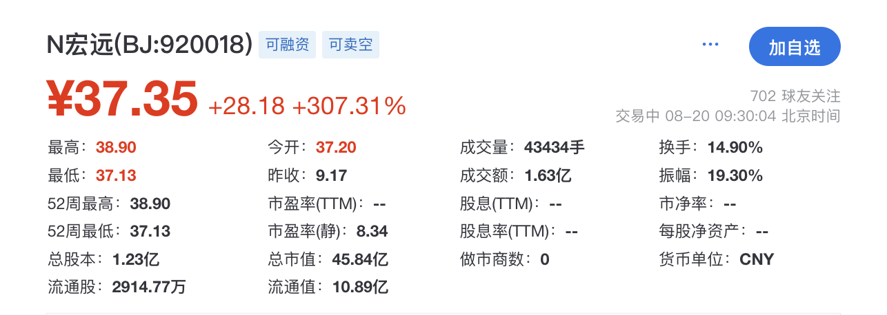 8月20日,N宏远(BJ920018)在北交所挂牌上市,保荐机构为民生证券,开盘涨307.31%,总市值45.84亿元。