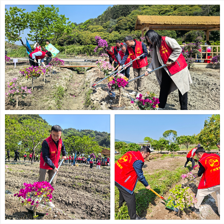 在简短的启动仪式后,参加植树活动的人员分组投入到绿化植树工作中。在紫田农业公园义务植树点,党员干部们干劲十足,手持铁锹或锄头,忙着扶树正苗、培土筑基,栽下象征坚韧不拔与顽强奋进的三角梅,掀起了全民义务植树的小高潮。经过一番努力,40多棵新栽种的三角梅树苗在紫田农业公园土地上挺立起来,这不仅是绿色的希望,更是大家为绿美广州贡献力量的生动见证。