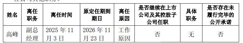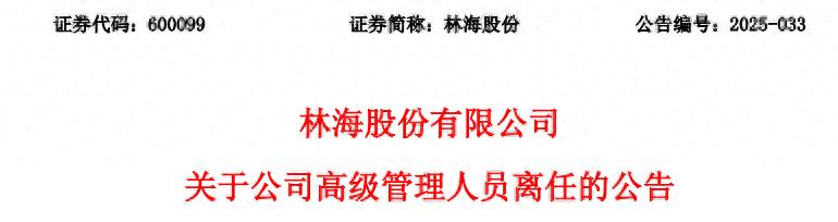 公告显示,林海股份董事会于11月3日收到副总经理高峰的辞职报告。因工作原因,高峰申请辞任该职务,其辞职报告自送达董事会之日起生效,辞任后不再担任公司其他职务。高峰原定任期到2026年11月23日,此次离任后将不在上市公司及其控股子公司任职,也不存在未履行完毕的公开承诺。
