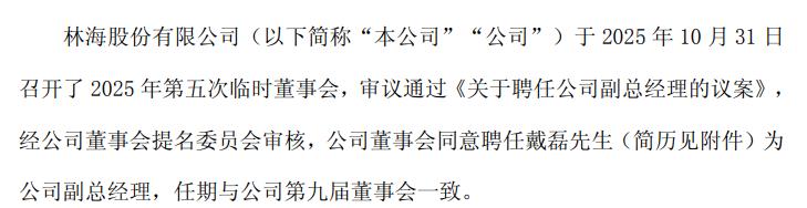 11月1日,林海股份发布公告称,公司于10月31日召开2025年第五次临时董事会,审议通过《关于聘任公司副总经理的议案》。经董事会提名委员会审核,董事会同意聘任戴磊为公司副总经理,任期与公司第九届董事会一致。