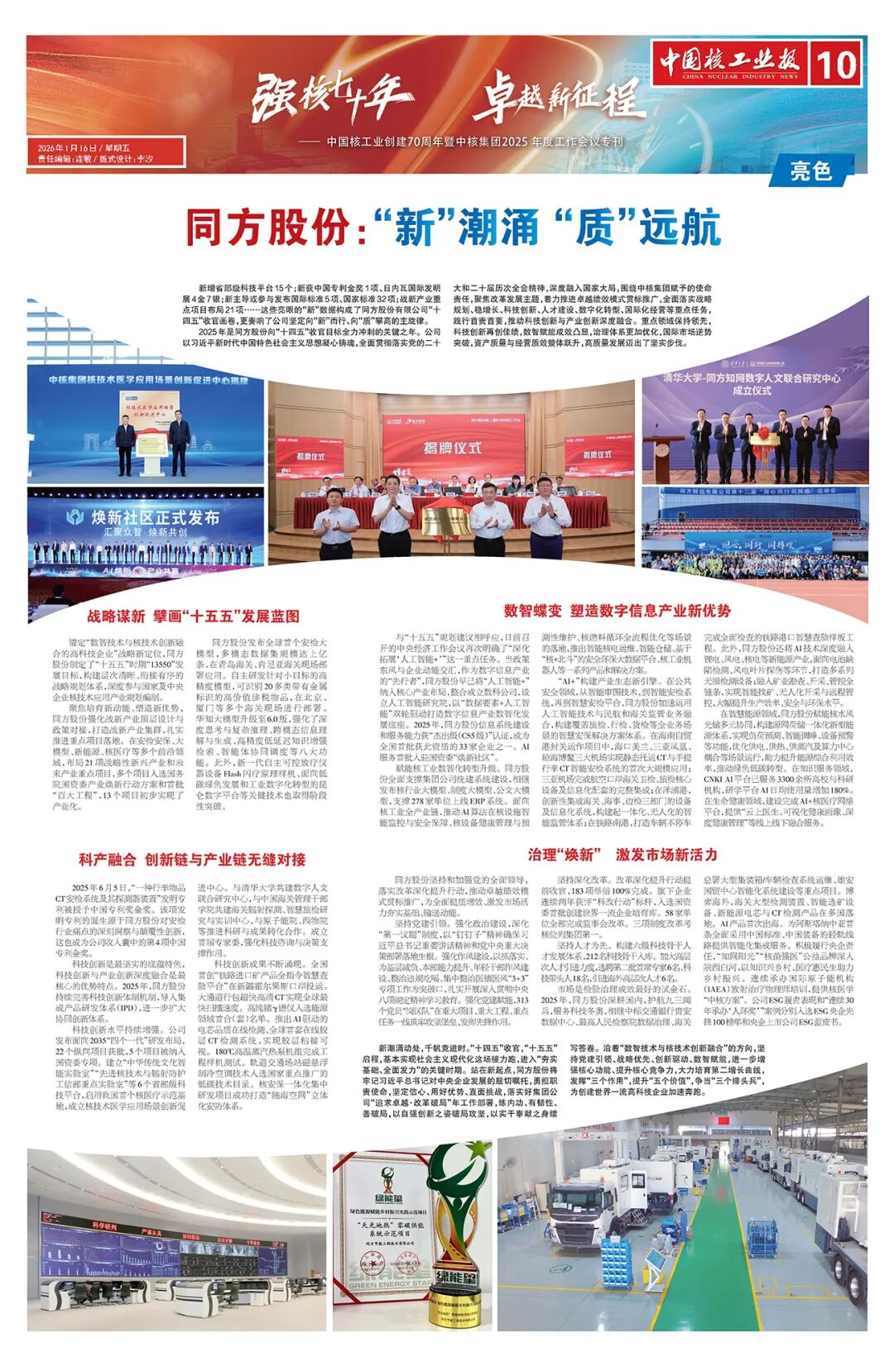 新潮涌动处,千帆竞进时。“十四五”收官,“十五五”启程,基本实现社会主义现代化这场接力跑,进入“夯实基础、全面发力”的关键时期。站在新起点,同方股份将牢记习近平总书记对中央企业发展的殷切嘱托,勇担职责使命,坚定信心、用好优势、直面挑战,以自强创新之姿破局攻坚,以实干奉献之身续写答卷。沿着“数智技术与核技术创新融合”的方向,坚持党建引领、战略优先、创新驱动、数智赋能,进一步增强核心功能、提升核心竞争力,大力培育第二增长曲线,发挥“三个作用”,提升“五个价值”,争当“三个排头兵”,为创建世界一流高科技企业加速奔跑。