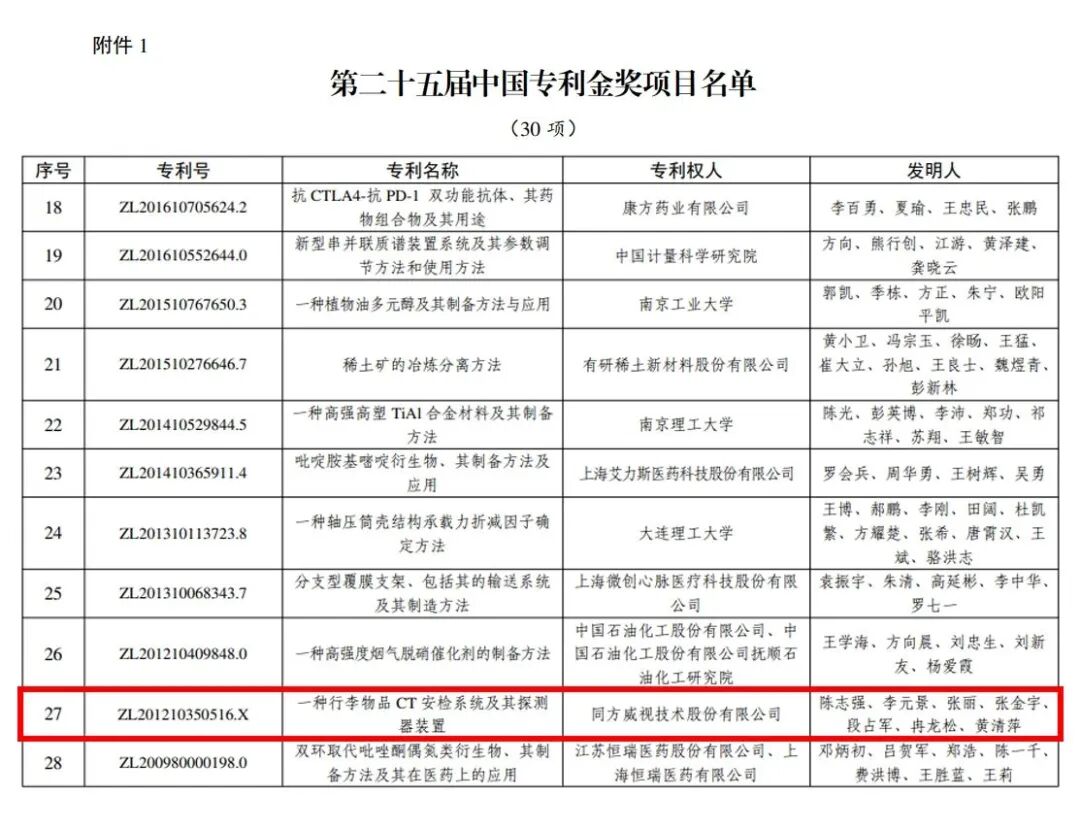 2025年6月5日,“一种行李物品CT安检系统及其探测器装置”发明专利被授予中国专利奖金奖。该项发明专利的诞生源于同方股份对安检行业痛点的深刻洞察与颠覆性创新,这也成为公司收入囊中的第4项中国专利金奖。