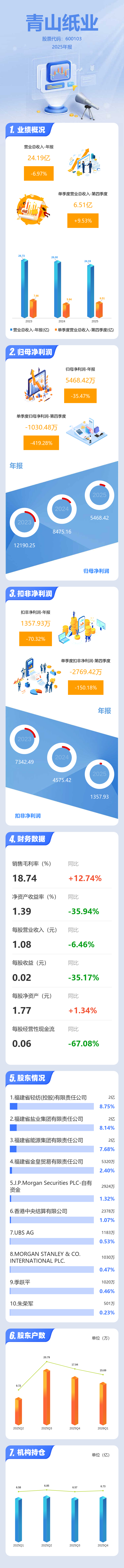 青山纸业2025年年报显示,当年度公司主营收入24.19亿元,同比下降6.98%;归母净利润5468.42万元,同比下降35.48%;扣非净利润1357.93万元,同比下降70.32%;其中2025年第四季度,公司单季度主营收入6.51亿元,同比上升9.54%;单季度归母净利润-1030.48万元,同比下降419.29%;单季度扣非净利润-2769.42万元,同比下降150.19%;负债率28.3%,投资收益2889.25万元,财务费用1442.07万元,毛利率18.74%。