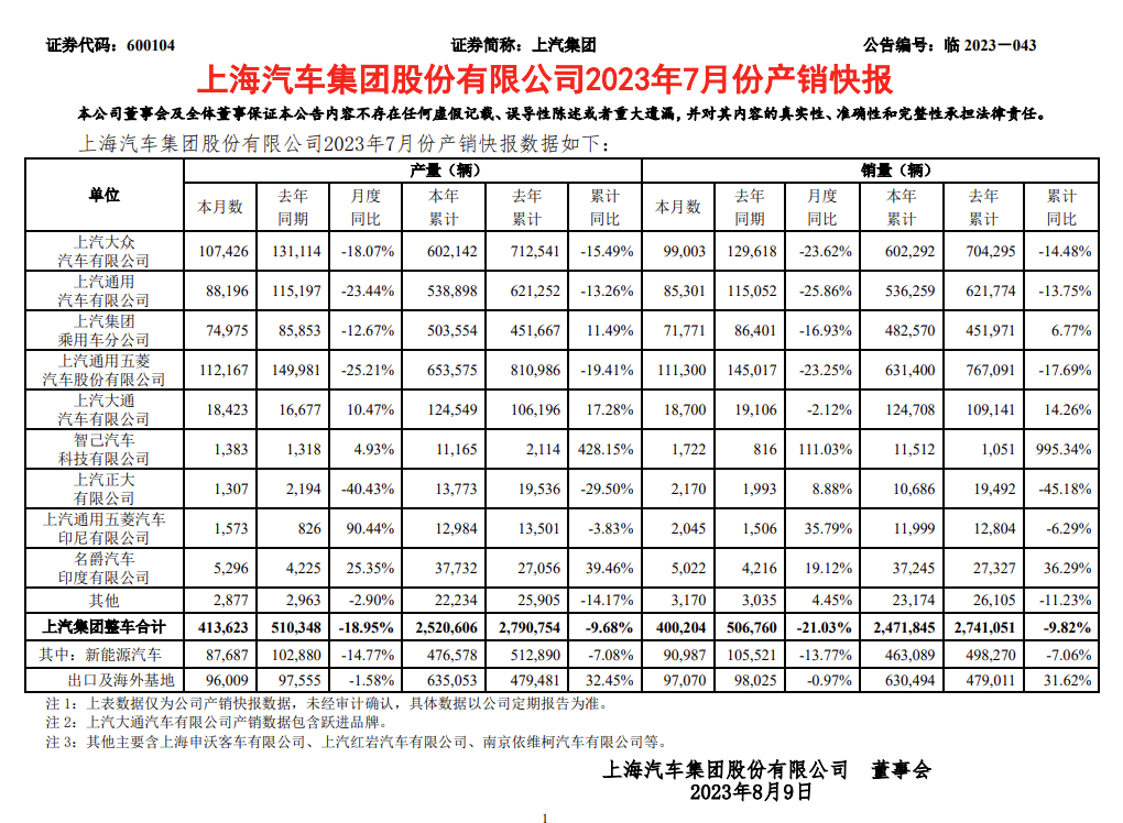 中国网汽车8月10日讯记者日前从官方获悉,上汽集团发布了2023年7月产销快报。根据数据显示,7月份,上汽集团整车销量为400,204 辆,同比下滑21.03%;本年累计销量2,471,845辆,同比下滑9.82%。