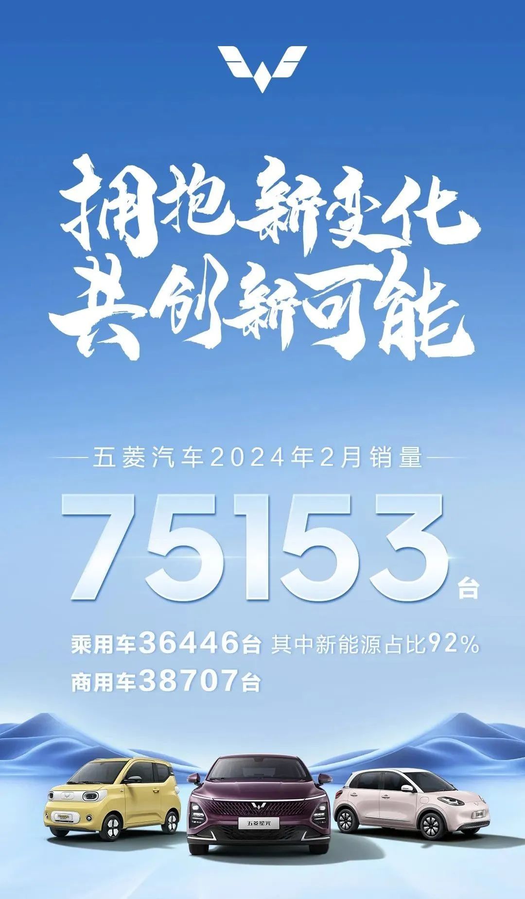 2月份,五菱汽车销量75153台,其中新能源占比92%。