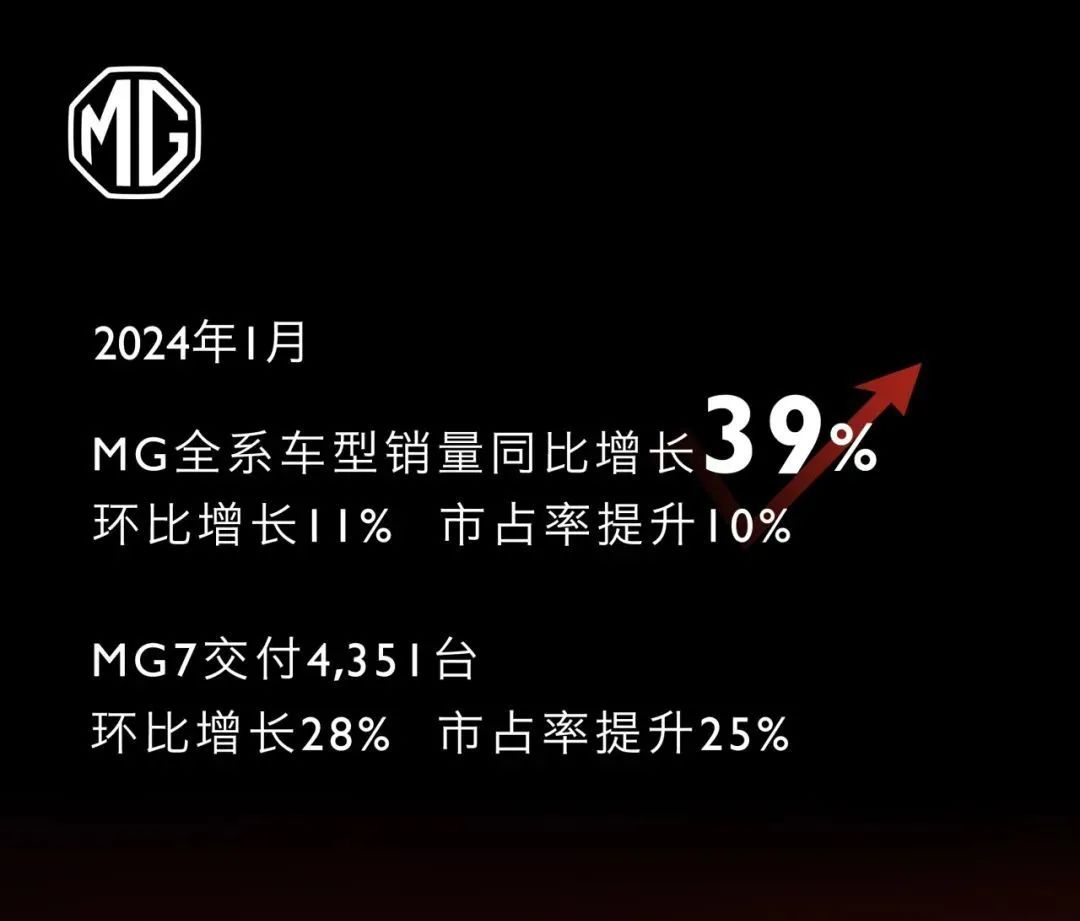 1月份,MG品牌迎来开门红,全球销量超过6.2万台。MG全系车型销量同比增长39%,环比增长11%,市占率提升10%。