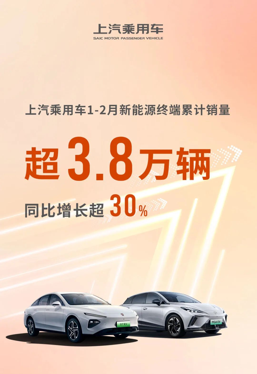 1-2月份,上汽乘用车新能源终端累计销量超3.8万辆,同比增长超30%。