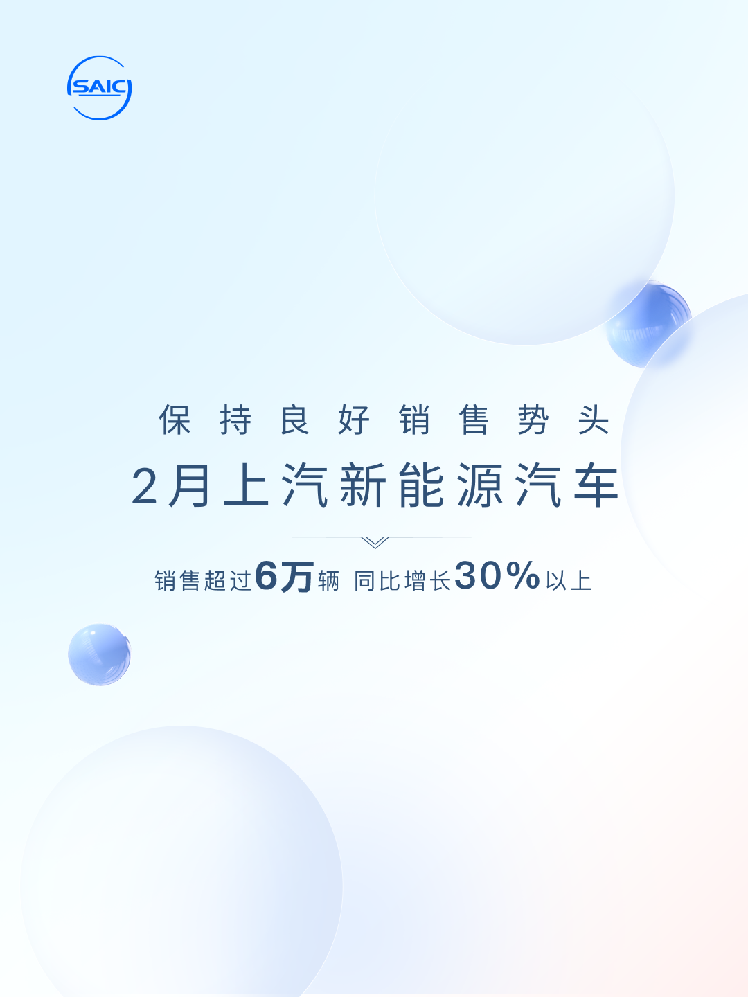 2月份,上汽集团销售新能源车超过6万辆,同比增长30%以上。