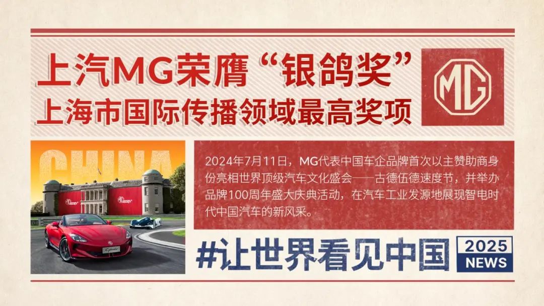 近日,上海市国际传播领域最高奖项、2024年度"银鸽奖"评选正式揭晓,上汽集团旗下MG品牌的"亮相英国古德伍德速度节"作品荣膺国际传播活动组别“优胜奖”,成为唯一获此殊荣的汽车品牌。