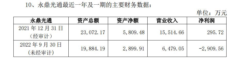 财务数据显示,永鼎光通2021年度营收为1.55亿元,净利润为295.72万元;2022年前三季度,永鼎光通营收为6479.05万元(未经审计,下同),净利润亏损2909.56万元。截至2022年9月30日,永鼎光通的净资产为2899.91万元。