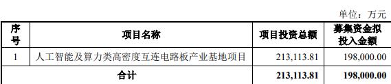 本次发行募集资金总额(含发行费用)不超过198,000.00万元(含本数),扣除发行费用后的募集资金净额将用于人工智能及算力类高密度互连电路板产业基地项目。