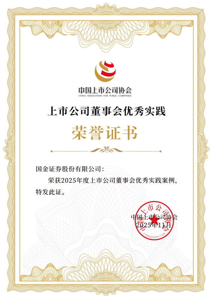 日前, 中国上市公司协会 正式发布“2025年度上市公司系列评选”结果, 国金证券 股份有限公司凭借在公司治理、董秘履职、可持续发展等领域的出色实践,获得一系列的殊荣。公司斩获“2025年度上市公司董事会优秀实践案例”“2025上市公司董事会办公室最佳实践”两项荣誉,董事会秘书周洪刚连续四年获评“上市公司董事会秘书履职5A评级”;此前,公司申报的《国金智慧签(电子印章)助力企业可持续发展案例》与《前沿探索大模型风险治理,建设“AI友好”型组织》已分别入选2025年上市公司可持续发展“最佳实践案例”与“优秀实践案例”。