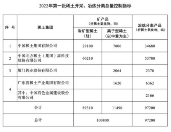 据2022年第一批稀土开采、冶炼分离总量指标,中重稀土供给并无增长,指标更加倾向于轻稀土。增加的1.68万吨轻稀土开采指标中,1.61万吨集中于北方稀土,占增量指标的96%,同比增长36%。未来轻稀土配额占比有望进一步提升,北方稀土集团未来或成为稀土供应增量的主要提供方。