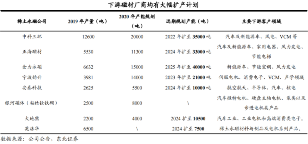 在双碳政策下,目前稀土下游磁材厂商均有大幅扩产计划,据东北证券统计,未来5年主要高端磁材企业产能CAGR(年复合增长率)达15.5%,侧面印证终端需求旺盛。