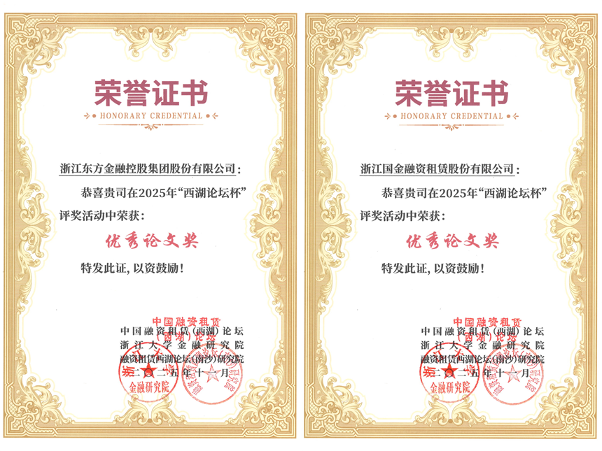 近日,由中国融资租赁(西湖)论坛、 浙江大学 金融研究院等主办的“AI赋能产融共进——中国融资租赁(西湖)论坛2025年主题峰会”在武汉盛大举行,公布了“2025年西湖论坛杯优秀论文奖”, 浙江东方 、国金租赁联合投稿的《云计算技术在融资租赁公司数字化转型中的应用》和《科技赋能新能源两轮车“换电租赁”》荣获“优秀论文奖”,并入选《中国融资租赁前沿问题探讨2025》( 中国金融出版社 )一书。这标志着 浙江东方 在融资租赁领域的科技创新工作成果获得了行业权威机构的高度认可。