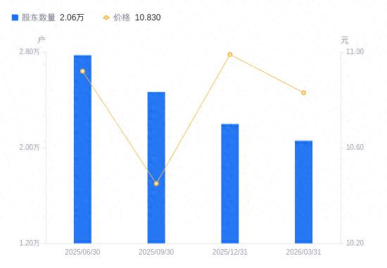 4月7日消息,数据显示,截至2026年3月31日,苏豪弘业A股股东总户数为2.06万户,较上期(2025年12月31日)减少1392户,降幅6.33%。公司最新A股总股本为2.52亿股,其中流通A股2.47亿股,户均持有流通A股数量为1.2万股,较上期增加758.86股,增幅6.76%;户均持流通A股市值12.98万元,较上期增加6422.41元,增幅5.21%。