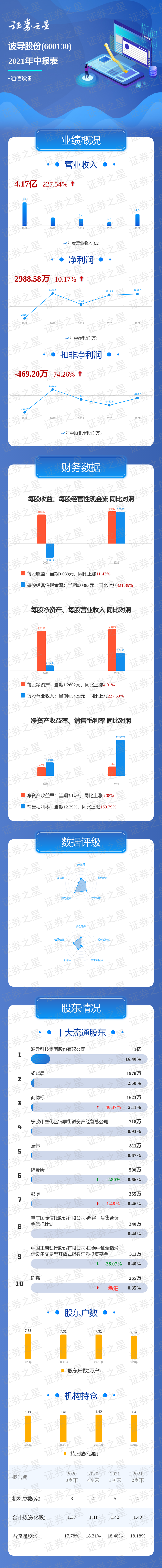 波导股份2021中报显示,公司主营收入4.17亿元,同比上升227.54%;归母净利润2988.58万元,同比上升10.17%;扣非净利润-469.2万元,同比上升74.26%;负债率19.82%,投资收益144.8万元,财务费用170.5万元,毛利率12.39%。