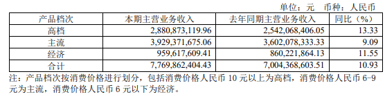 上半年,重庆啤酒高档产品(10元以上)实现收入28.81亿元,同比增长13.33%,主流(6到9元)产品和经济型(6元以下)产品收入分别为39.29亿元、9.60亿元,对应的增速分别为9.09%、11.55%。