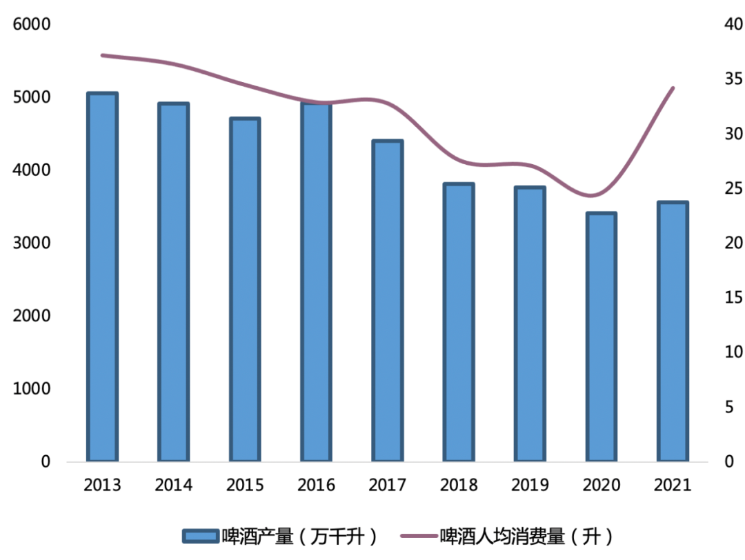 受啤酒主流消费人群(20岁至50岁)数量减少、产品同质化严重等因素影响,自2013年以来我国啤酒产量整体处于下降趋势,由2013年的5061.5万千升下降至2021年的3562.4万千升,相应的啤酒人均消费量也由2013年的37.2升连续下滑至2020年的24.6升,后于2021年回升至34.2升。