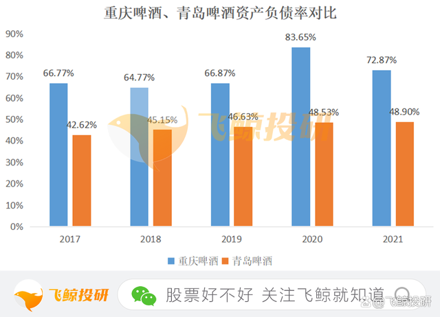 2017-2021年,重庆啤酒的资产负债率依次为66.77%、64.77%、66.87%、83.65%、72.87%,负债水平比其他企业要高出许多,例如青岛啤酒过去五年的资产负债率从未超过50%。