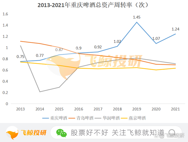 最后,飞鲸投研想说,从净资产收益率的角度来看,重庆啤酒比青岛啤酒、华润啤酒都要优秀,而且对roe进行拆解之后,重庆啤酒的净利率、总资产周转率和权益乘数都是最优秀的。